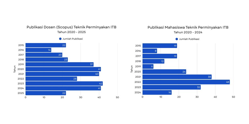 Gambar di atas menampilkan perkembangan jumlah publikasi ilmiah dosen dan mahasiswa Program Studi Teknik Perminyakan ITB yang terindeks Scopus pada periode tahun 2015 hingga 2025. Data ini mencerminkan peningkatan aktivitas riset dan kontribusi akademik dari sivitas akademika dalam bidang teknik perminyakan dan energi.