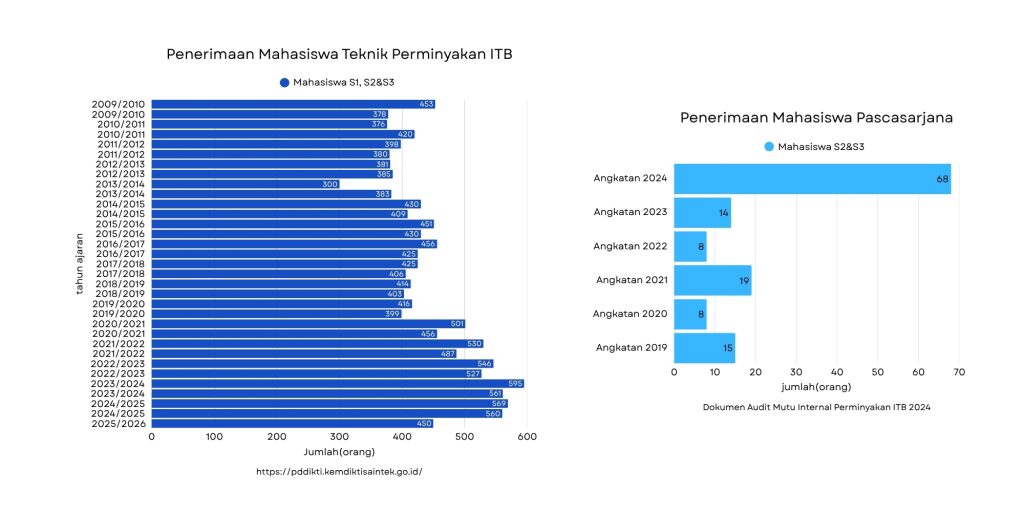 Pada grafik sebelah kiri, terlihat perkembangan jumlah mahasiswa S1 Teknik Perminyakan ITB dari tahun akademik 2009/2010 hingga 2025/2026. Data menunjukkan tren peningkatan signifikan dalam satu dekade terakhir, dengan jumlah mahasiswa baru berkisar antara 300 hingga hampir 600 orang per tahun ajaran. Informasi ini bersumber dari Pangkalan Data Pendidikan Tinggi (PDDIKTI).